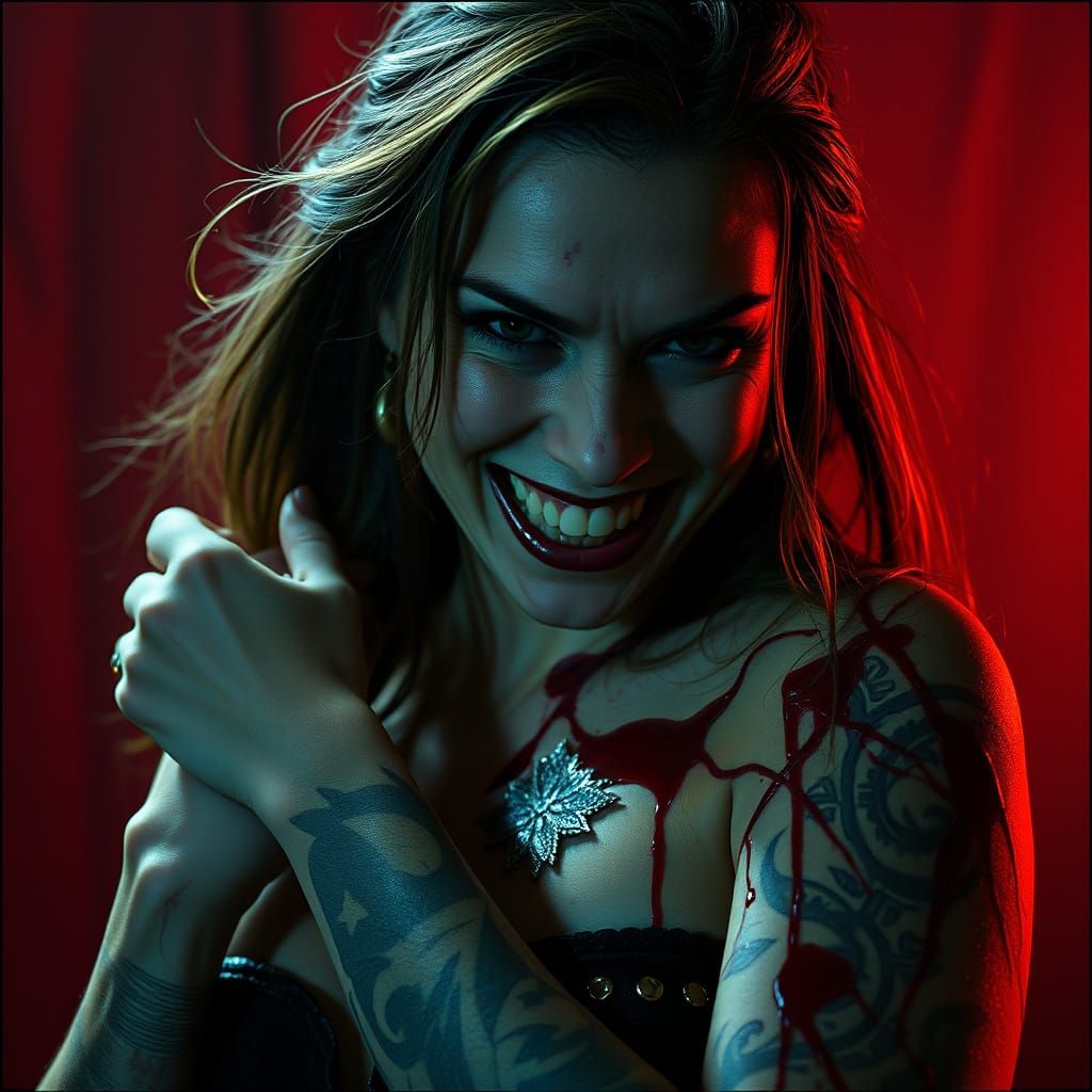 This image shows a furious red-haired woman armed with a knife, wearing a tattooed thong and covered in blood. The dramatic, cinematic scene features epic lighting and a dark, tense atmosphere as 35mm film grain adds texture.
