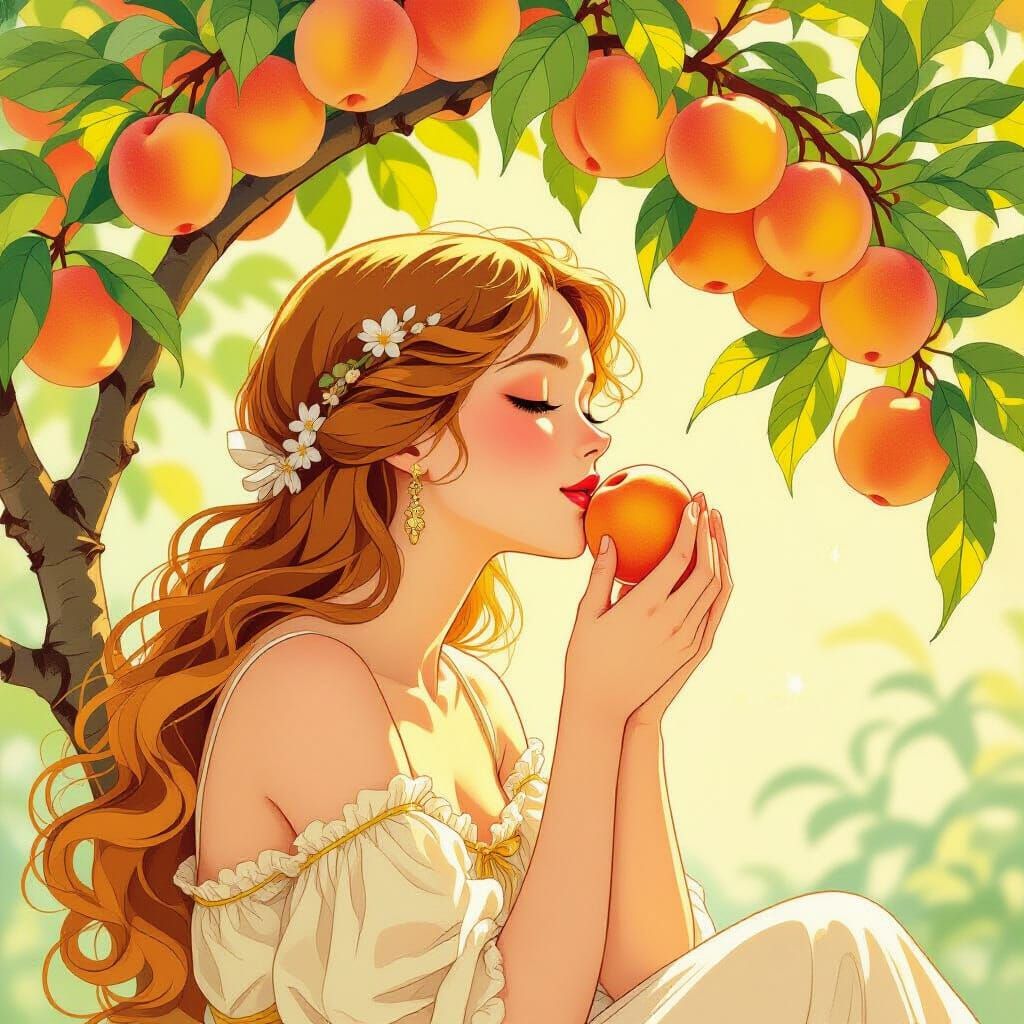 Art Nouveau Poem Comic Peaches Girl Beneath the peach tree, laden, sweet, A maiden reads, a cool retreat. Her book unfolds, a world unseen, While blushing peaches glow between.