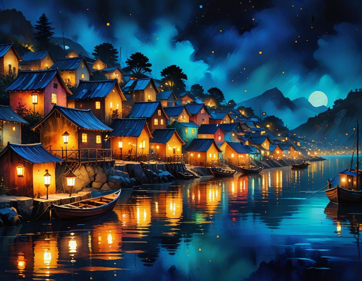 A vibrant expressionist image of a fishing village at night, reflected in the water. Warm golden light from glowing lanterns creates a dreamy, misty ambiance.