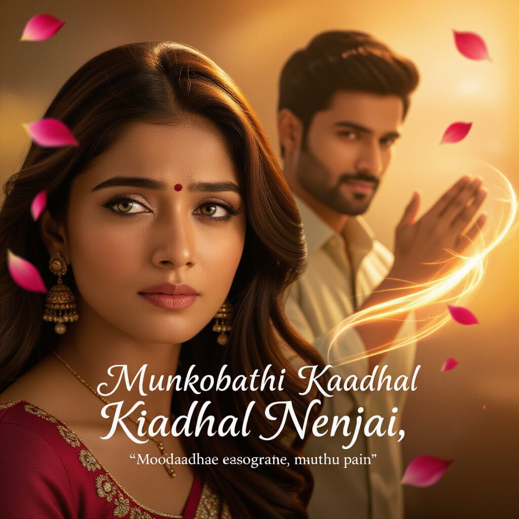 A cinematic portrait of a South Asian woman with pearl-like eyes, bathed in warm golden light, conveying quiet anger and distant emotion. A man reaches towards her, symbolizing suppressed love and pain.