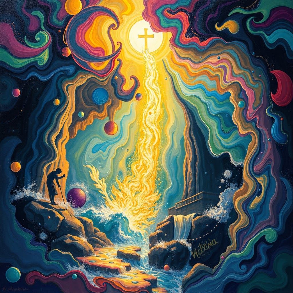 This image shows a vibrant, Candyland-inspired biblical scene of grace and prayer. Gouache paint creates an ethereal atmosphere with luminous colors and soft light, emphasizing spiritual energy and movement.