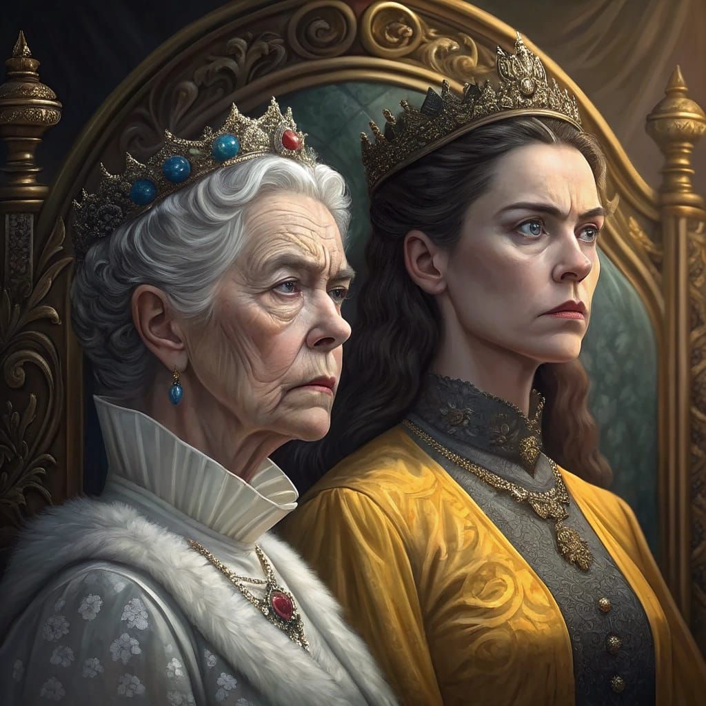A detailed portrait of two aging medieval queens in a royal bed. One appears stern, while the other offers comfort, depicted with dynamic lighting and rich colors.