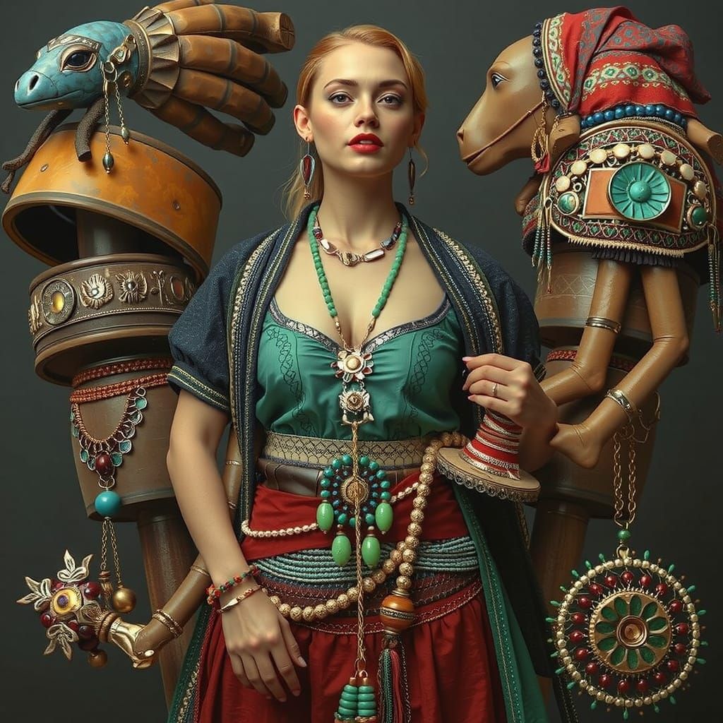 This image shows a tall woman in an outdoor setting. Her long auburn hair cascades down her back, and she is elegantly dressed in earthy tones with vibrant handcrafted accessories. The image is photorealistic.