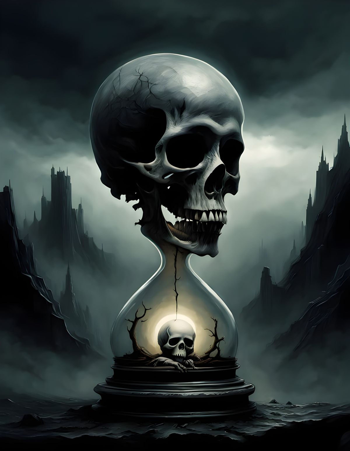 This image shows a delicate, vulnerable baby gazing up at a skull in a sandglass, surrounded by dark, muted tones that evoke a melancholic atmosphere. The baby's wide eyes and outstretched hand convey a sense of wonder and mortality.