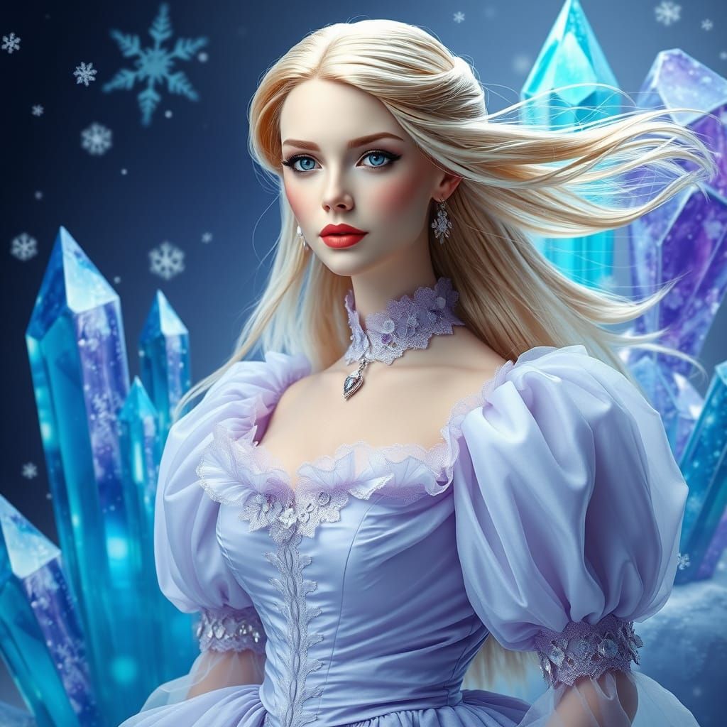 A striking picture of a blonde woman in a periwinkle Victorian gown with long flowing hair, surrounded by colorful crystals and snowflakes. The image has vibrant, ethereal colors and translucent textures in a surreal dreamscape.