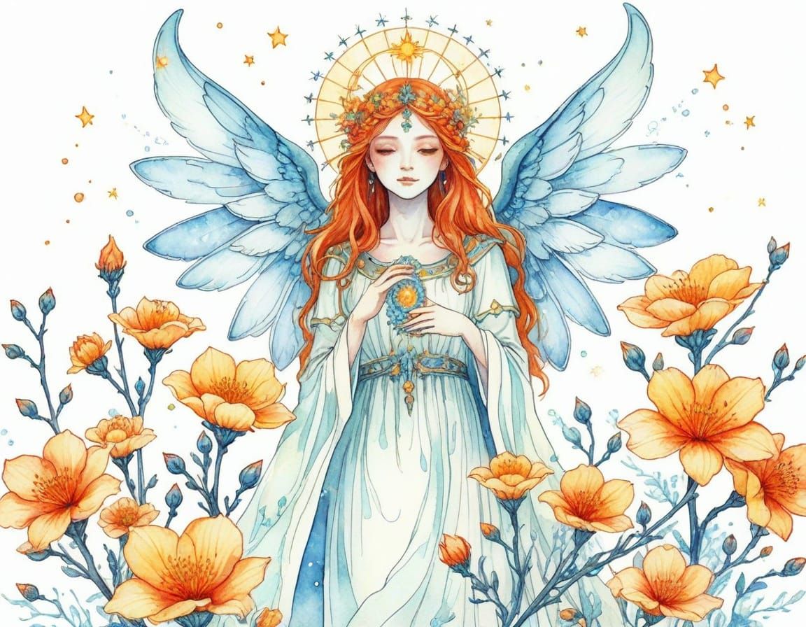 A vibrant watercolor illustration of a mystical angel priestess. The scene features glowing bioluminescent flora, delicate ink lines and a soft, ethereal aura, creating a cosmic, fantasy aesthetic.