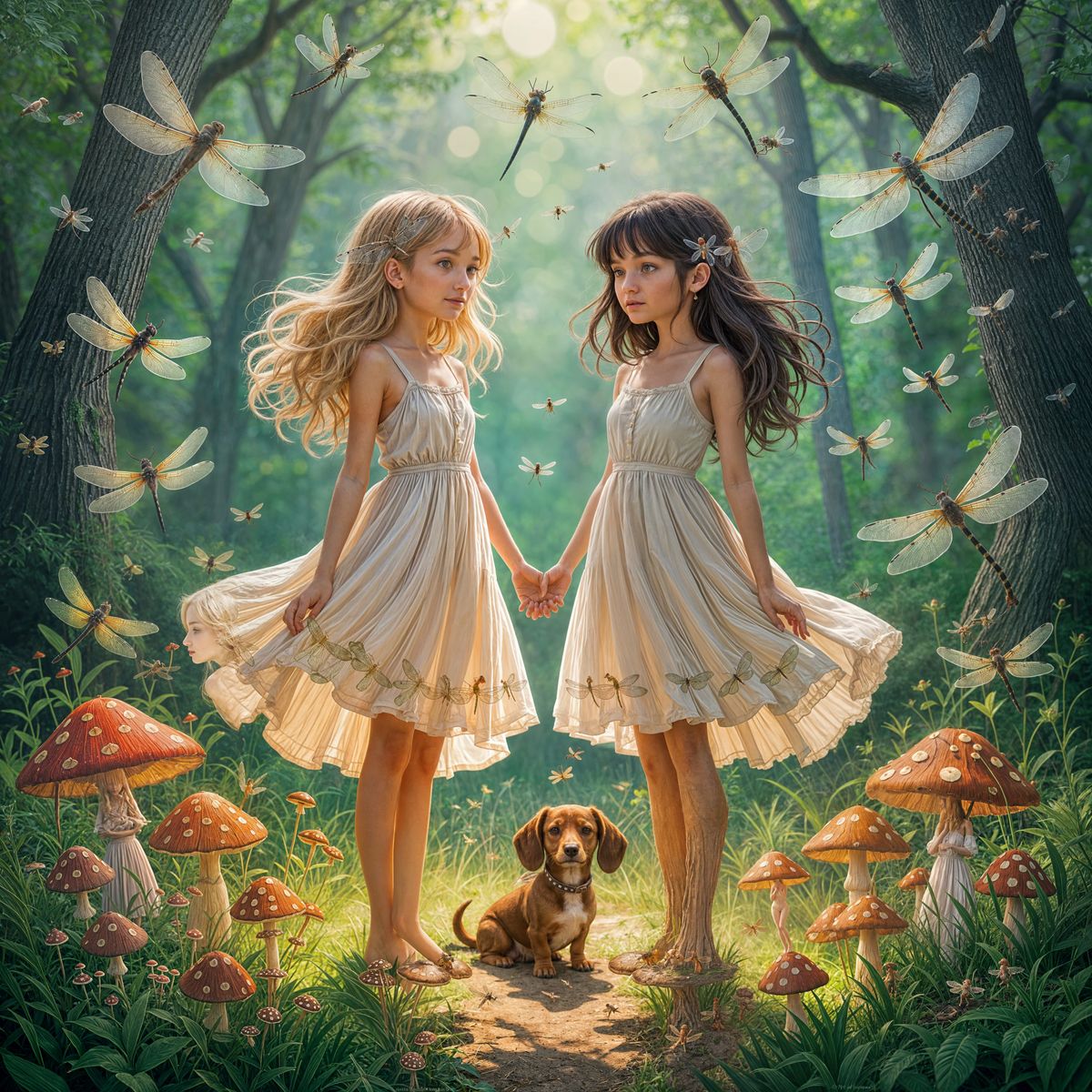 A whimsical image of two girls in sundresses encircled by human-like dragonflies. A dachshund sits among glowing mushrooms in a fairy forest with intricate details, in a fantastical anime style.