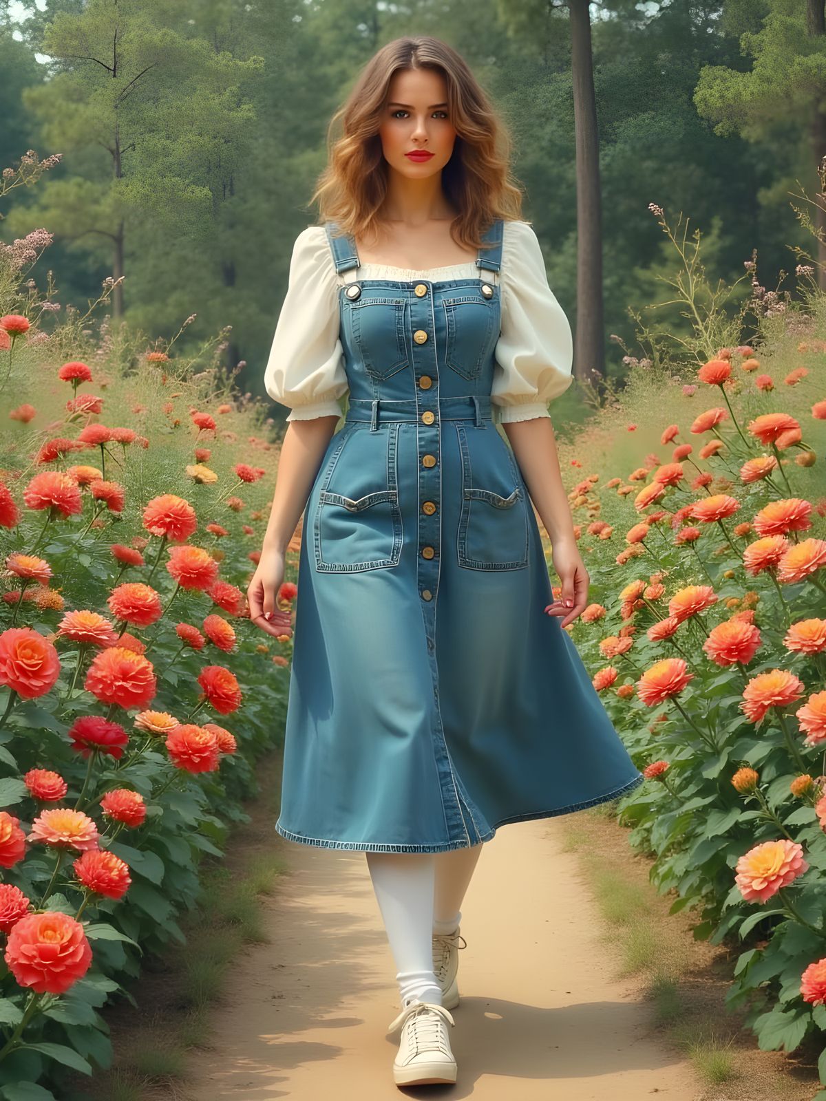 A vibrant image of a curvy woman in a denim dress walking through a flower garden. The scene blends art nouveau and pop art elements, creating a visually striking, colorful portrait.