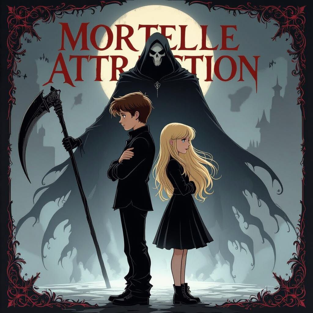 A gothic scene depicts a brown-haired boy and blonde girl standing back-to-back as a figure of Death looms. The digital art features dark patterns, metallic accents, and ornate details.