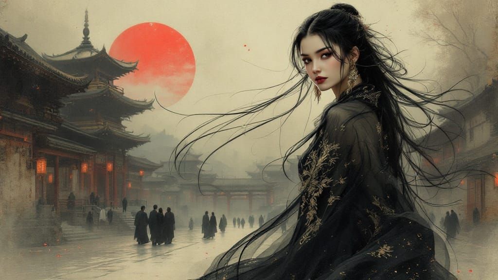 This image captures a regal East Asian woman with flowing hair and a gold-embroidered gown in a twilight courtyard. The artwork features a blend of painterly fantasy, ink-wash elements, and dark elegance, with a weathered sun and pagoda architecture.