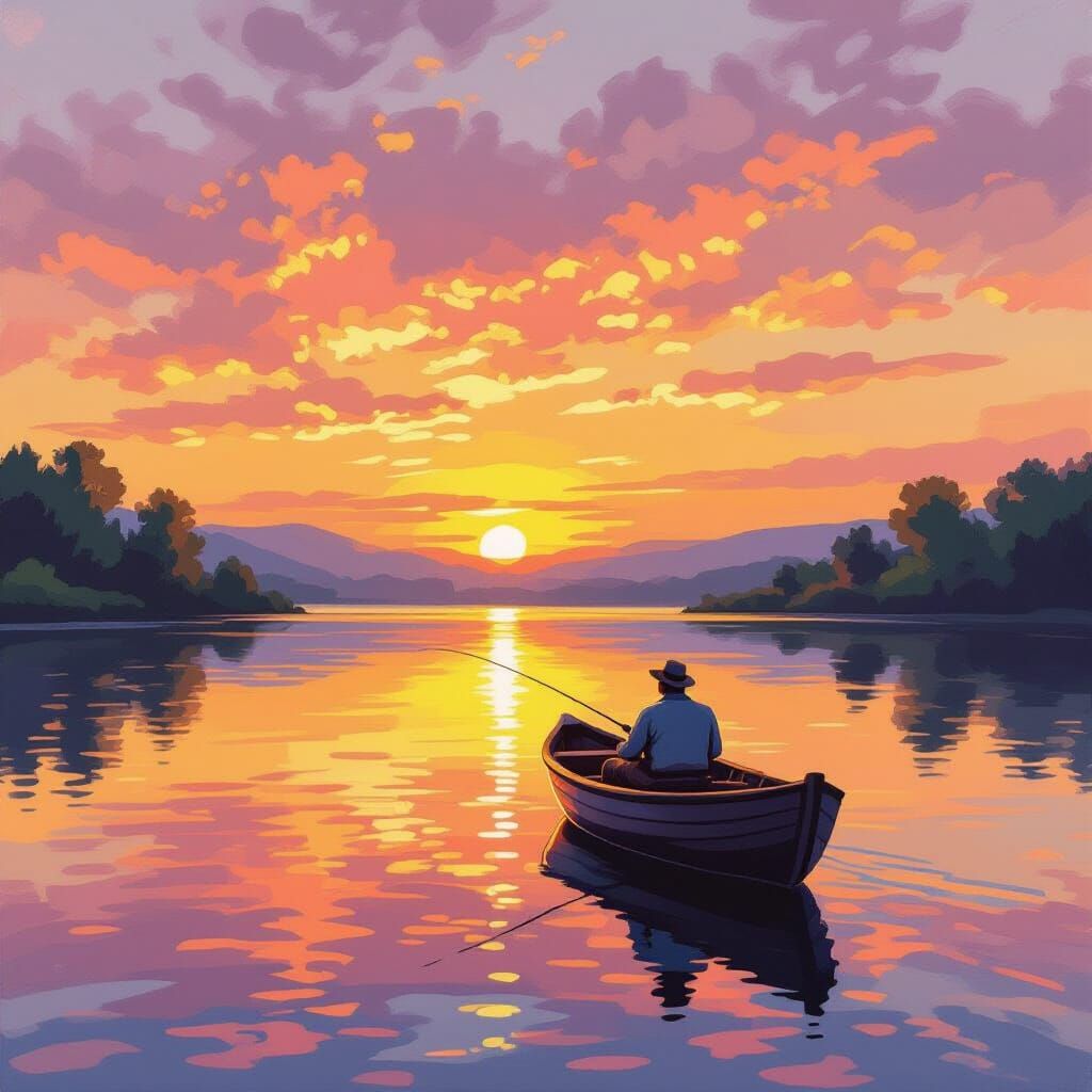 This image shows a vibrant, colorful sunrise over a calm country lake. A lone fisherman in a boat casts his line, with reflections of the orange and gold sky on the water. Rendered in an impressionist style with visible brushstrokes.