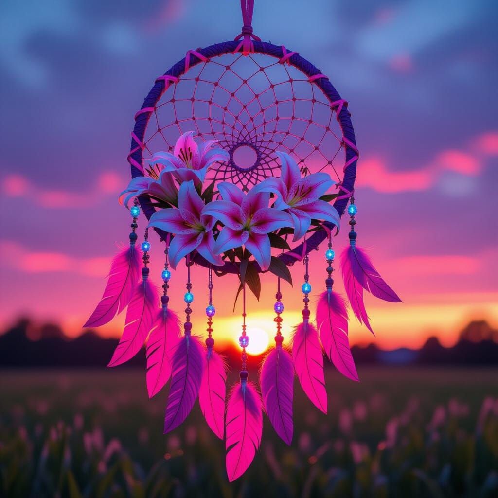 A striking picture of pink lilies blooming within a large, detailed purple dreamcatcher. Hot pink feathers hang from the bottom, accented by neon ribbons, set against a vaporwave sunset in a futuristic, neon aesthetic.