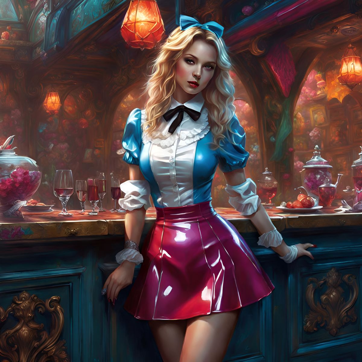 This image features a beautiful and flirty Alice in Wonderland character in a fantastical setting. The artwork is a hyperdetailed digital painting with contrasting polychromatic colors.