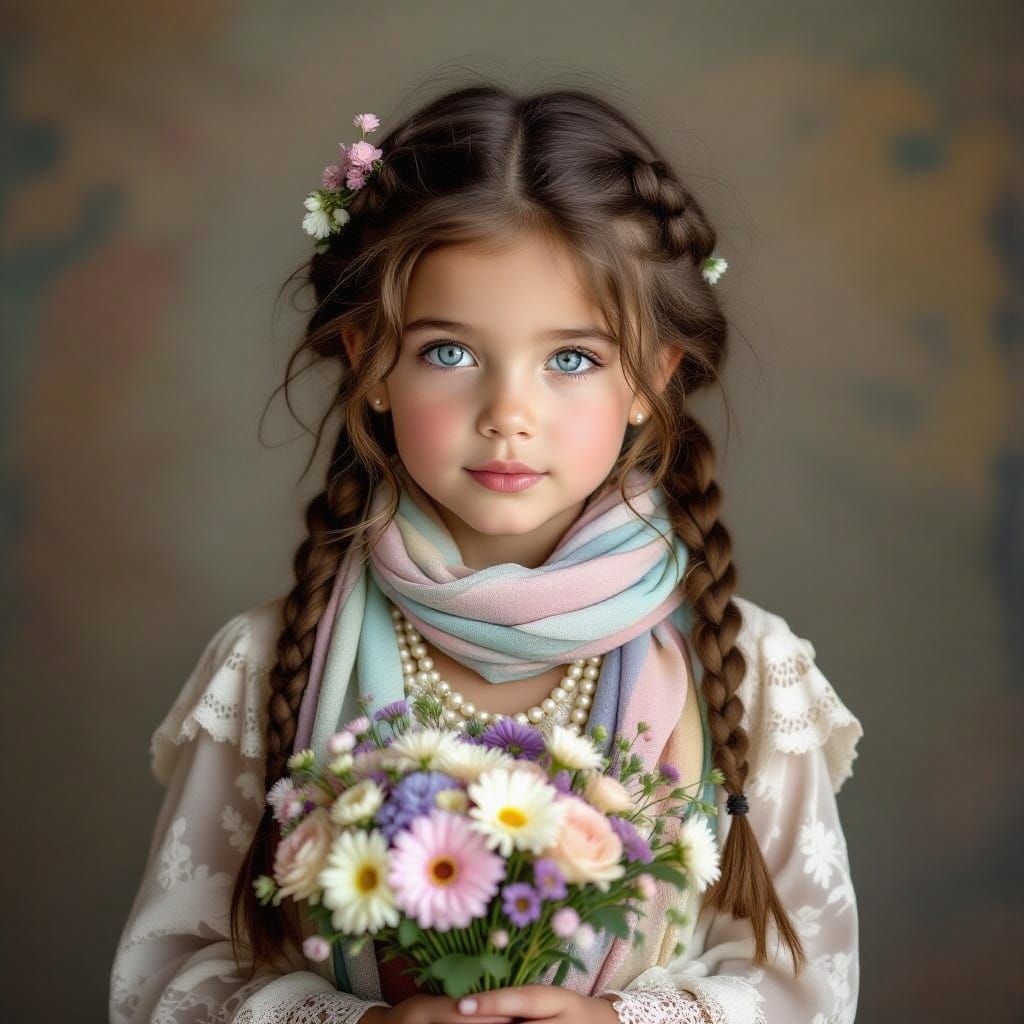 This image shows a young girl with blue eyes and a bohemian style, surrounded by lavish decorations and holding a bouquet of flowers, in a warm and soft focus aesthetic inspired by Art Nouveau and Impressionist techniques