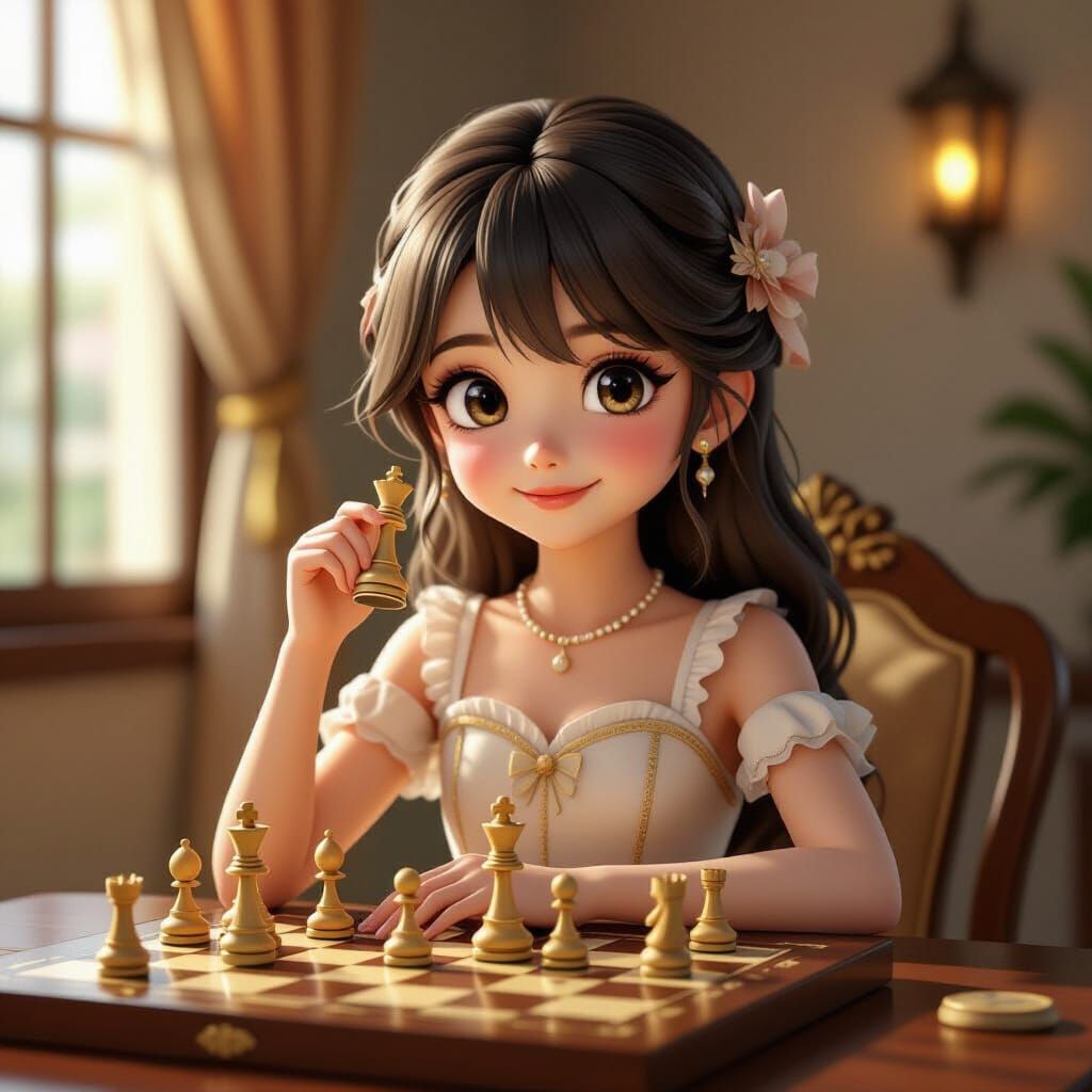This image shows a young girl with a confident smile, seated at a chessboard in soft lighting. The artwork blends 3D anime art with ultrafine details and vibrant colors in a digital art style.