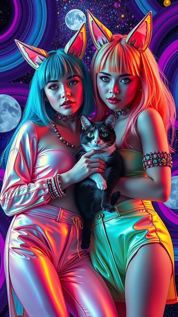 A vivid image of Gemini twins and Doja Cat in a surreal psychedelic setting. The artwork features expressive lines and an airbrushed, neon-lit aesthetic in a contemporary style.