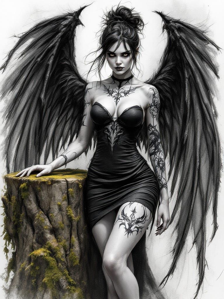 A dynamic graphite sketch of a young fae woman with dark hair and wings made of fire, captured in confident, economical lines with deliberate incompleteness and expressive details.