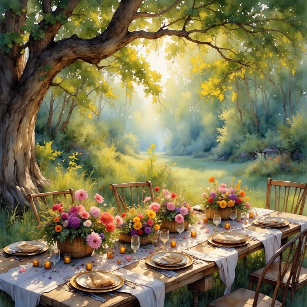 Design your own enchanting cottagecore wedding feasts and decorations. Free and easy AI image generation.