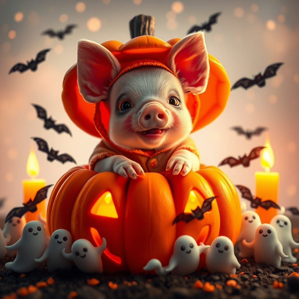 This image shows a charming baby piglet in a pumpkin outfit, nestled in a glowing jack-o-lantern with spectral candles and bats. Features a magical pastel neon Halloween night sky. Photorealistic, cinematic lighting.
