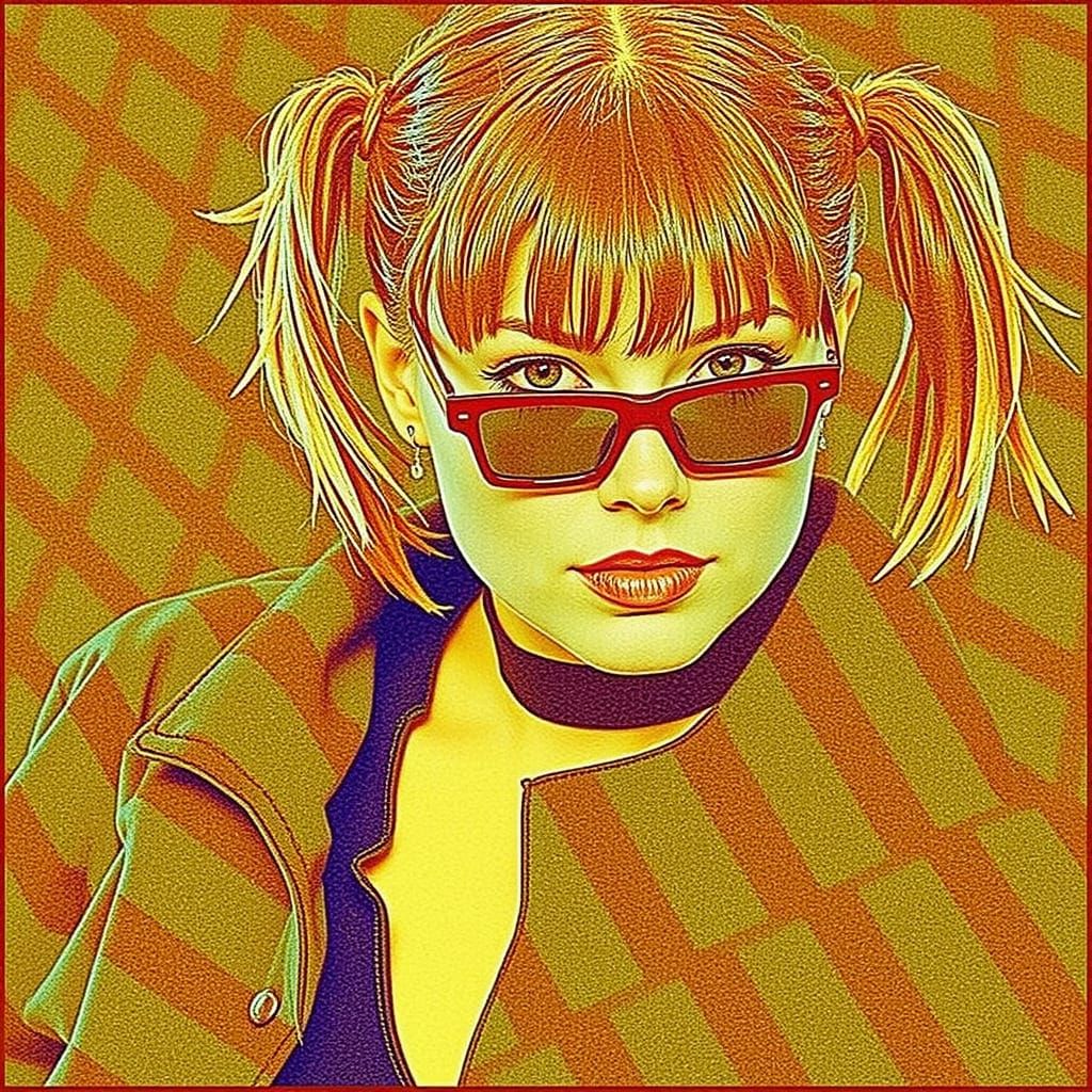 This image showcases a striking woman with bold, edgy style, featuring spiky red and black hair, futuristic sunglasses, and a modern, avant-garde outfit.