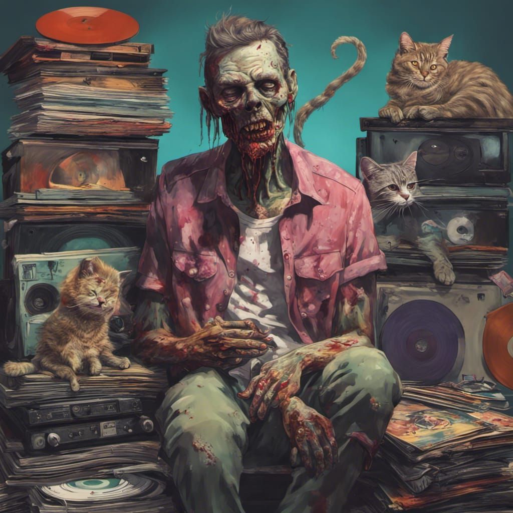 This image shows a zombie and a cat enjoying vinyl records. The hyperrealistic splash art style features intricate details, dramatic lighting, and a colorful background.