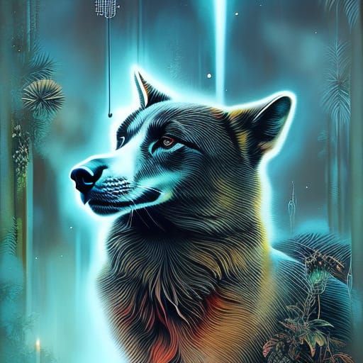 This image shows an elegant furry dog in a double exposure cyberpunk style. The digital painting features intricate details, golden outlines, and vibrant triadic colors.