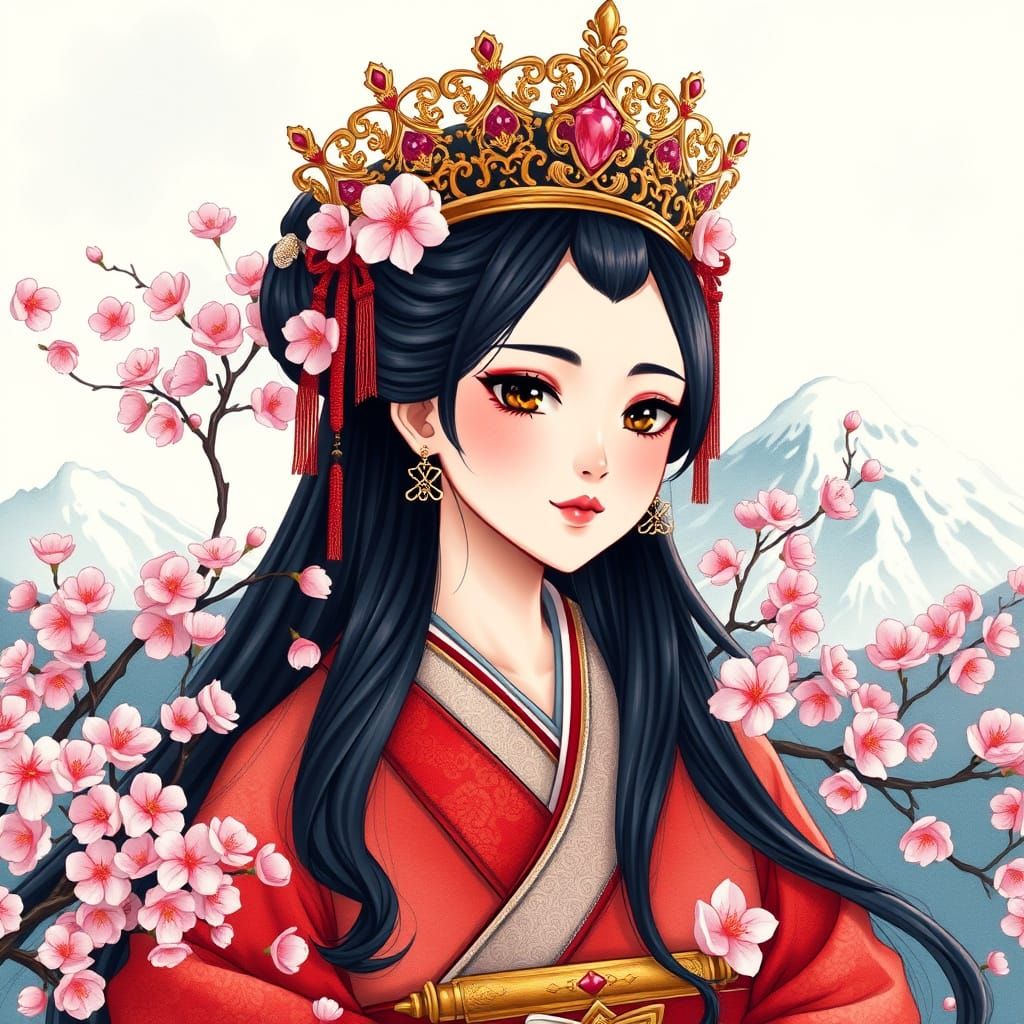 This image shows a stunning anime-style princess surrounded by cherry blossoms, set against a soft watercolor background with snow-capped mountains, featuring intricate details and delicate embroidery.