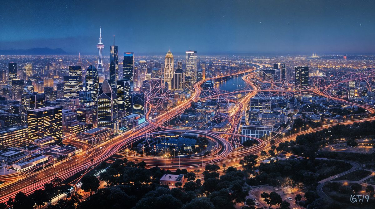 This oil painting depicts a city at twilight, its buildings and streets transformed into a living, breathing organism by the intricate network of blood vessels and circulation, creating a striking visual fusion of urban and biological systems.