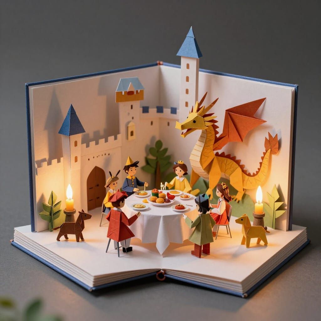 Make unique origami fairytale scenes with princes, princesses, dragons, and animals. Free and easy AI image generation.