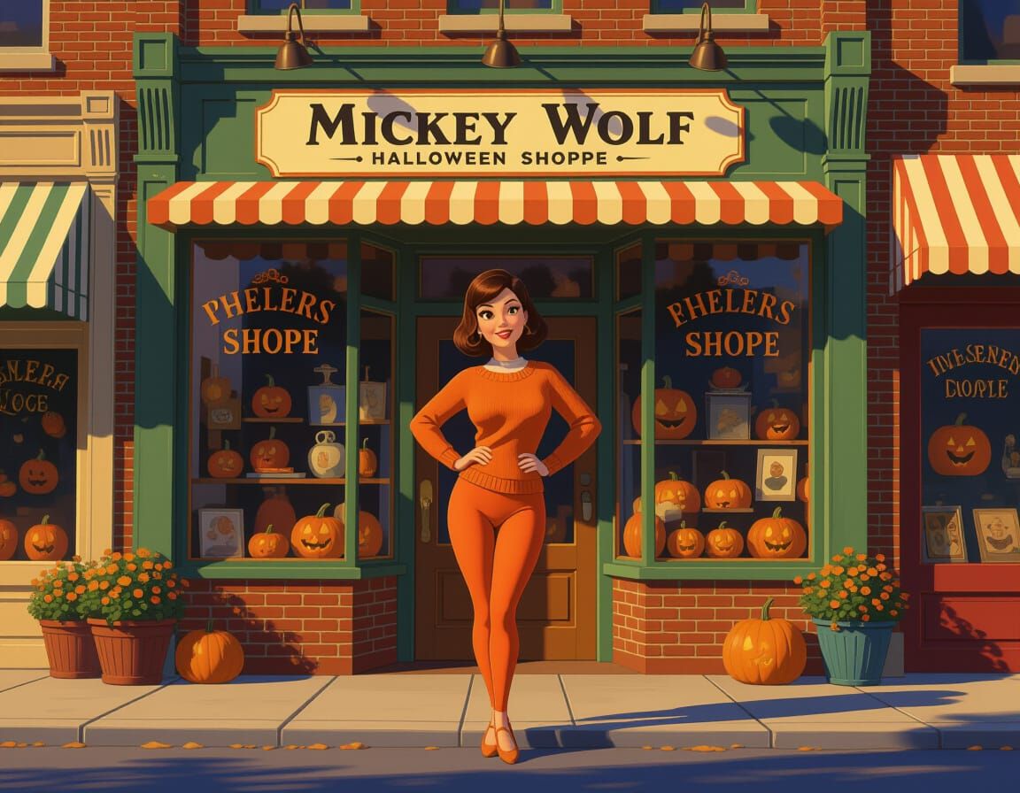 Pixar concept art, (a store front that says)(MickeyWolf Halloween Shoppe) a beautiful mature women, EE cup bosom, Brunette bob cut hair, wearing orange leggings, orange sweater, in a pin-up pose, Standing in front of a store in a small town, sharp focus, cinematic lighting, vibrant colors