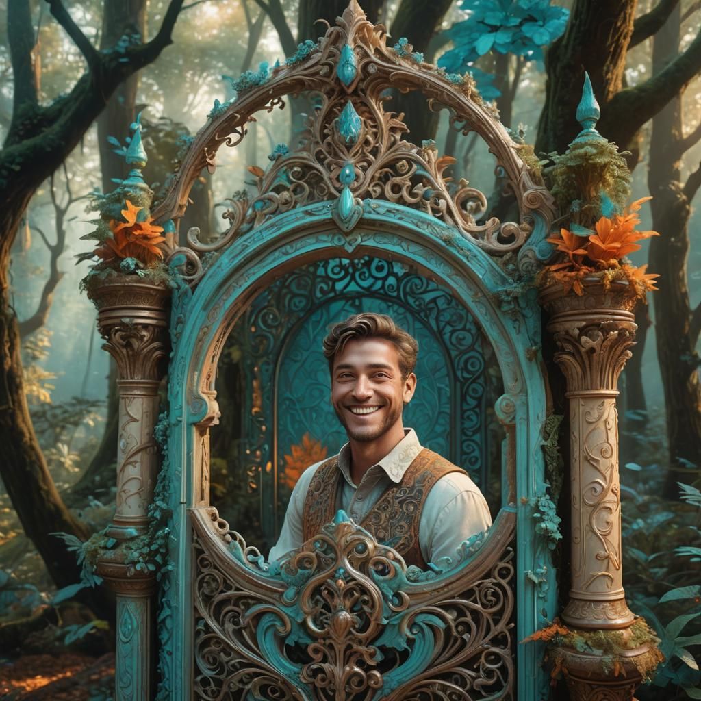 A man smiles while holding an ornate bed post in a magical forest. The scene is bathed in complementary turquoise and orange light, rendered as detailed digital art.