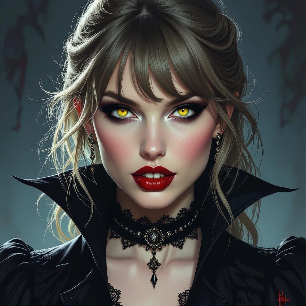 This image shows Taylor Swift transformed into a fearsome vampire with wrinkled nose, sunken eyes, and sharp fangs. Rendered in a dark fantasy style with gothic atmosphere.