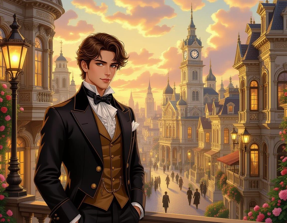 This image shows a majestic young man in Victorian attire within a historical city. The artwork features warm, golden lighting and ornate architecture, rendered in a highly detailed anime style with cozy realism.