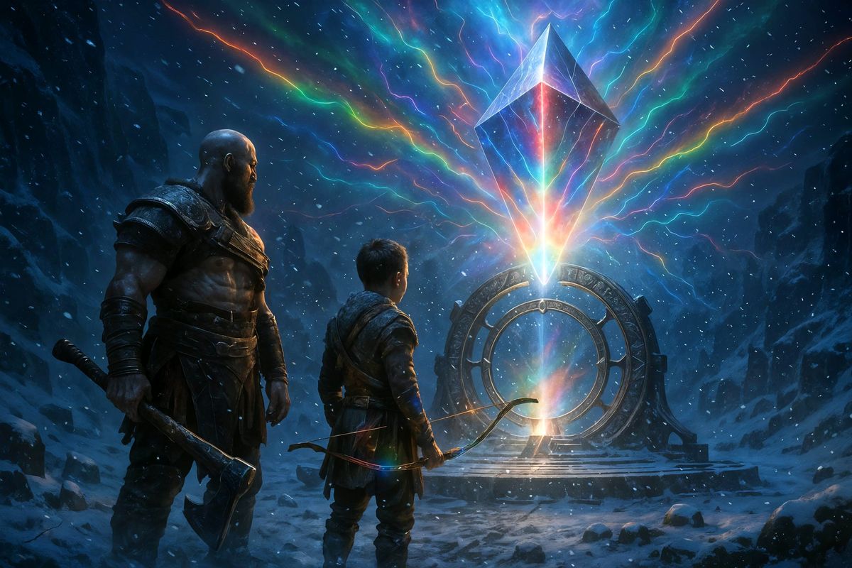 A vivid scene of Kratos and Atreus at the Bifrost. The prism emits rainbow light through a snowy, frozen realm, with auroras in the sky and glowing runes, rendered with photorealistic detail.
