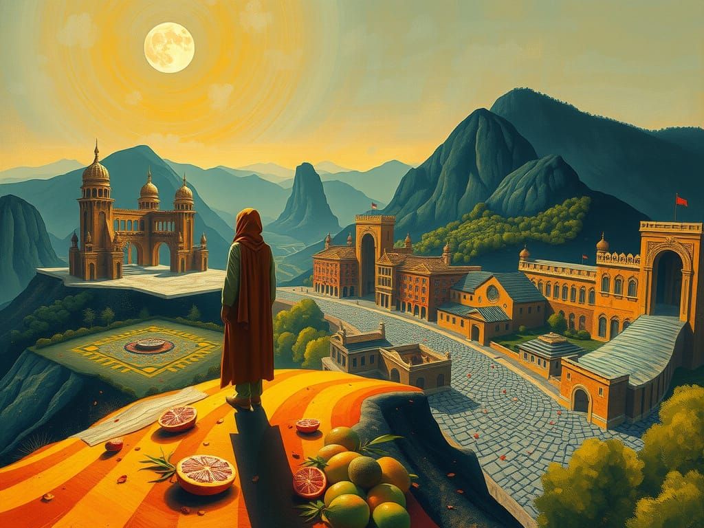 A solitary figure stands on a windswept hill overlooking a vast, dreamlike landscape filled with colossal, animal-shaped buildings adorned with intricate mosaics, bathed in the soft glow of moonlight casting long, dancing shadows. The air is thick with the scent of exotic fruits, and the cobblestone ...
