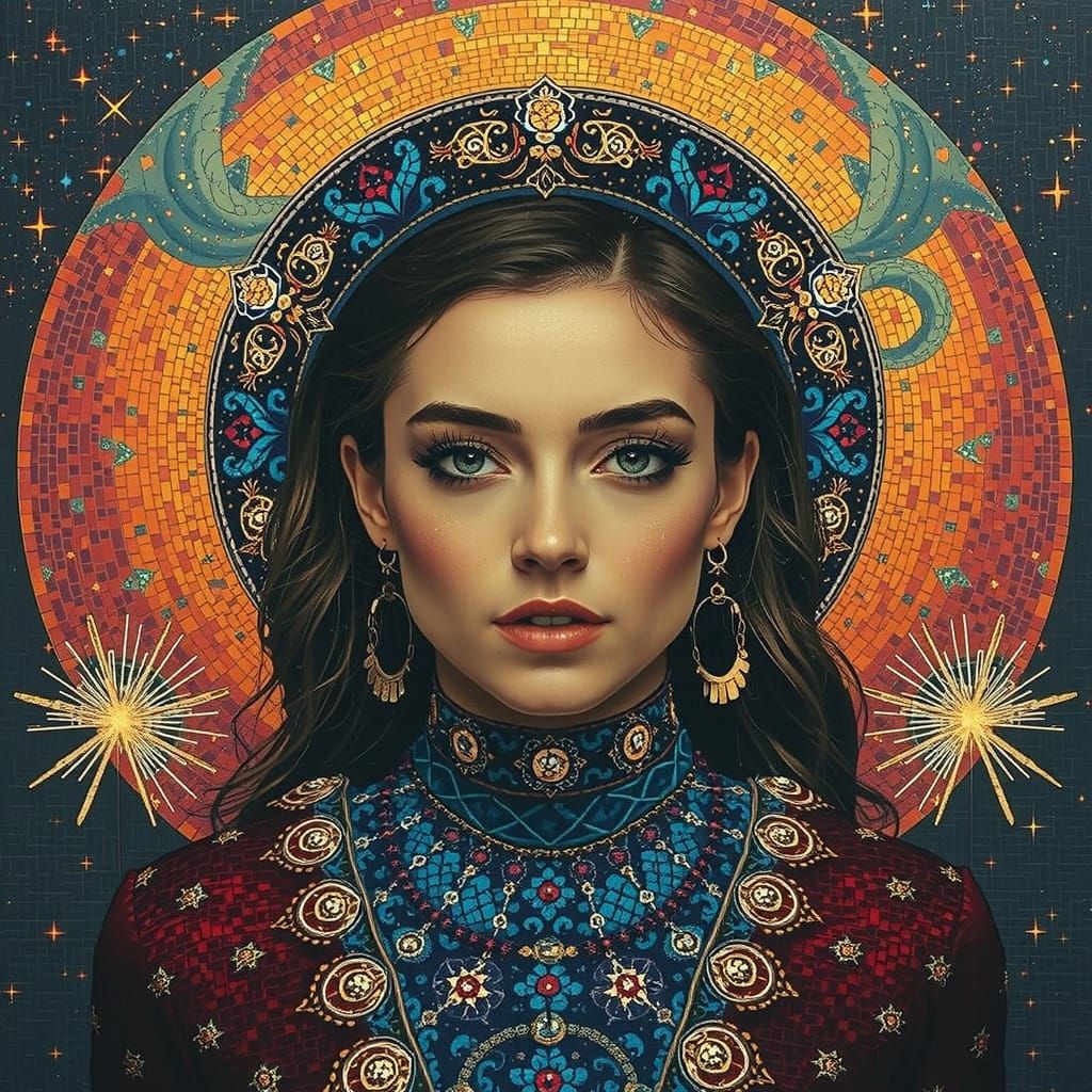 A mosaic artwork of a woman with iridescent colors rippling across her skin, set against a deep starry night sky. The image is a maximalist rendering with intricate detail.