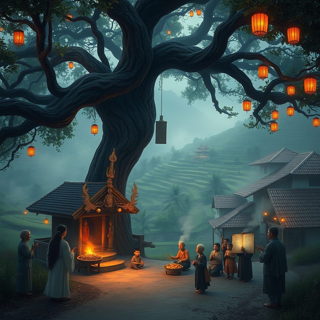 This image depicts a serene scene of the earth god Tudigong near a humble roadside shrine, surrounded by villagers offering incense and fruit, with the spirits of ancestors hovering nearby. The atmosphere is filled with a soft glow of lanterns, the scent of sandalwood, and a sense of divine presence, ins...