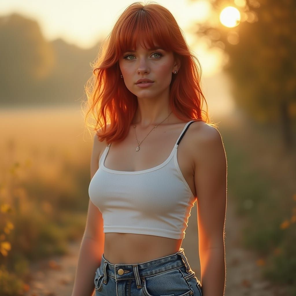 This image is a photorealistic portrait of a young woman in a serene autumnal landscape, showcasing her toned physique and vibrant red hair, with a warm golden light casting a glow on her skin.