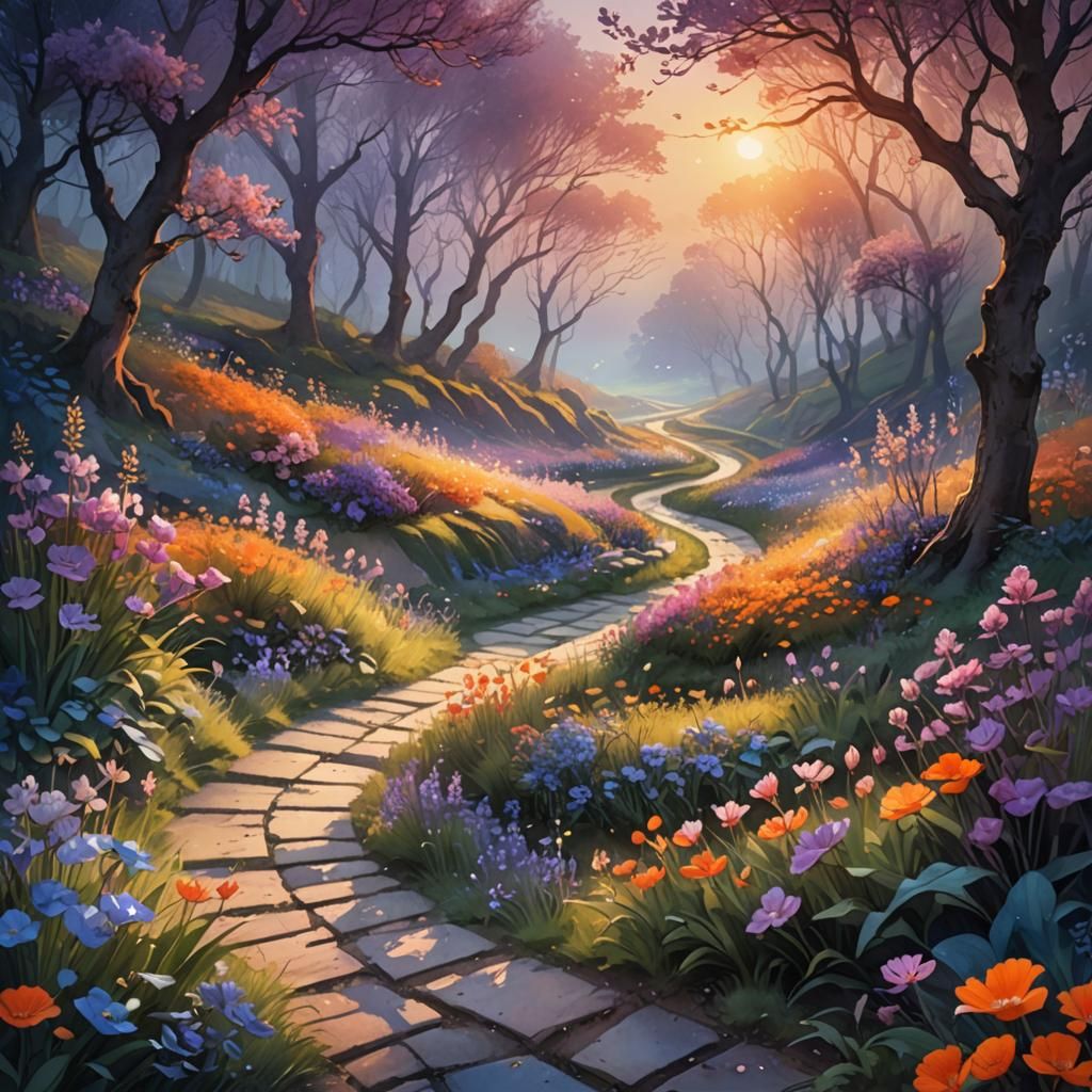 A vibrant digital watercolor illustration of a spring landscape at sunset. The artwork features soft, volumetric light, deep colors, and intricate details, creating a fantastical and serene scene.
