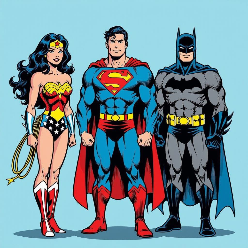 This image depicts Wonder Woman, Superman, and Batman together. It captures a classic comic book aesthetic with vibrant colors and dynamic poses.
