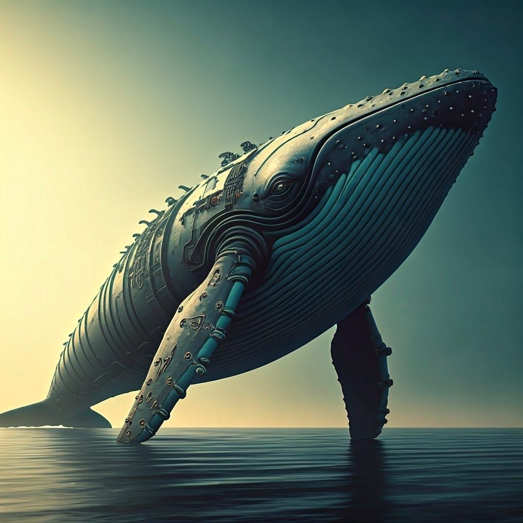 A striking picture of a massive, whale-like Perucetus colossus standing on land. The creature features mechanical details and a metallic sheen, rendered in an 8-bit meets CGI aesthetic.