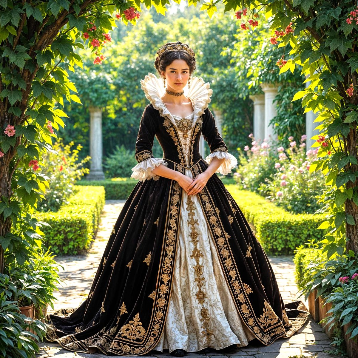 A graceful Elizabethan noblewoman from the 1590s stands in a sun-dappled garden. Her detailed velvet gown and jeweled ruff are rendered with meticulous detail, in a warm color palette inspired by Renaissance masters.
