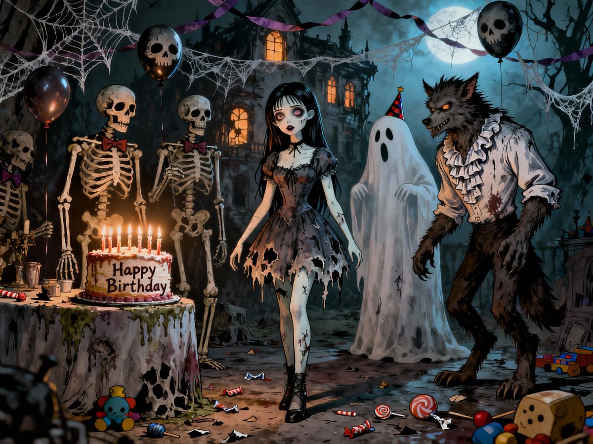 This image depicts Lenore, the zombie girl, celebrating her birthday with friends in a gothic, darkly whimsical style reminiscent of classic horror illustrations.