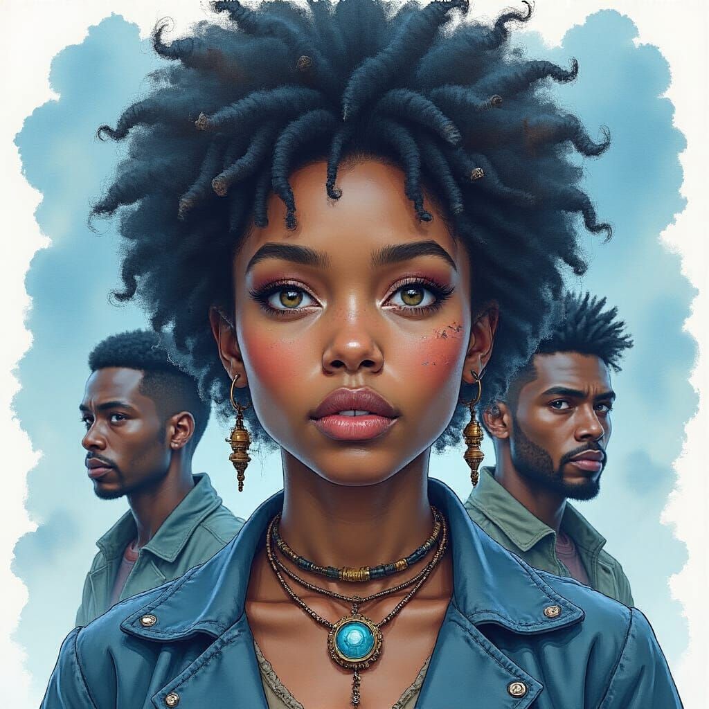 This watercolor artwork captures the essence of being young, gifted, and Black from an Afrofuturist viewpoint. It showcases ageless characters with authentic representation in an energetic, close-up composition.