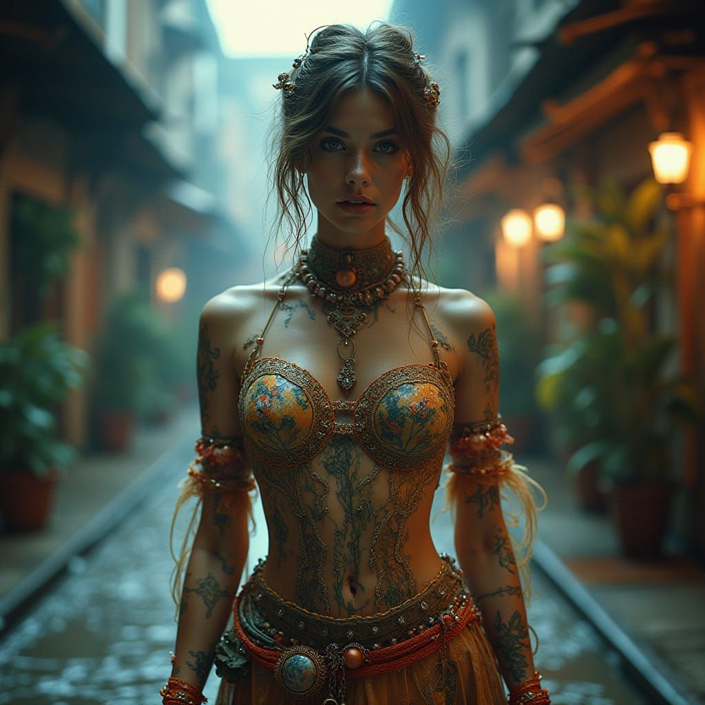 This image shows a beautiful woman in an ornate, futuristic outfit. The cinematic shot features film grain, a vignette, and dramatic lighting, creating an atmospheric tone as 35mm film photography.