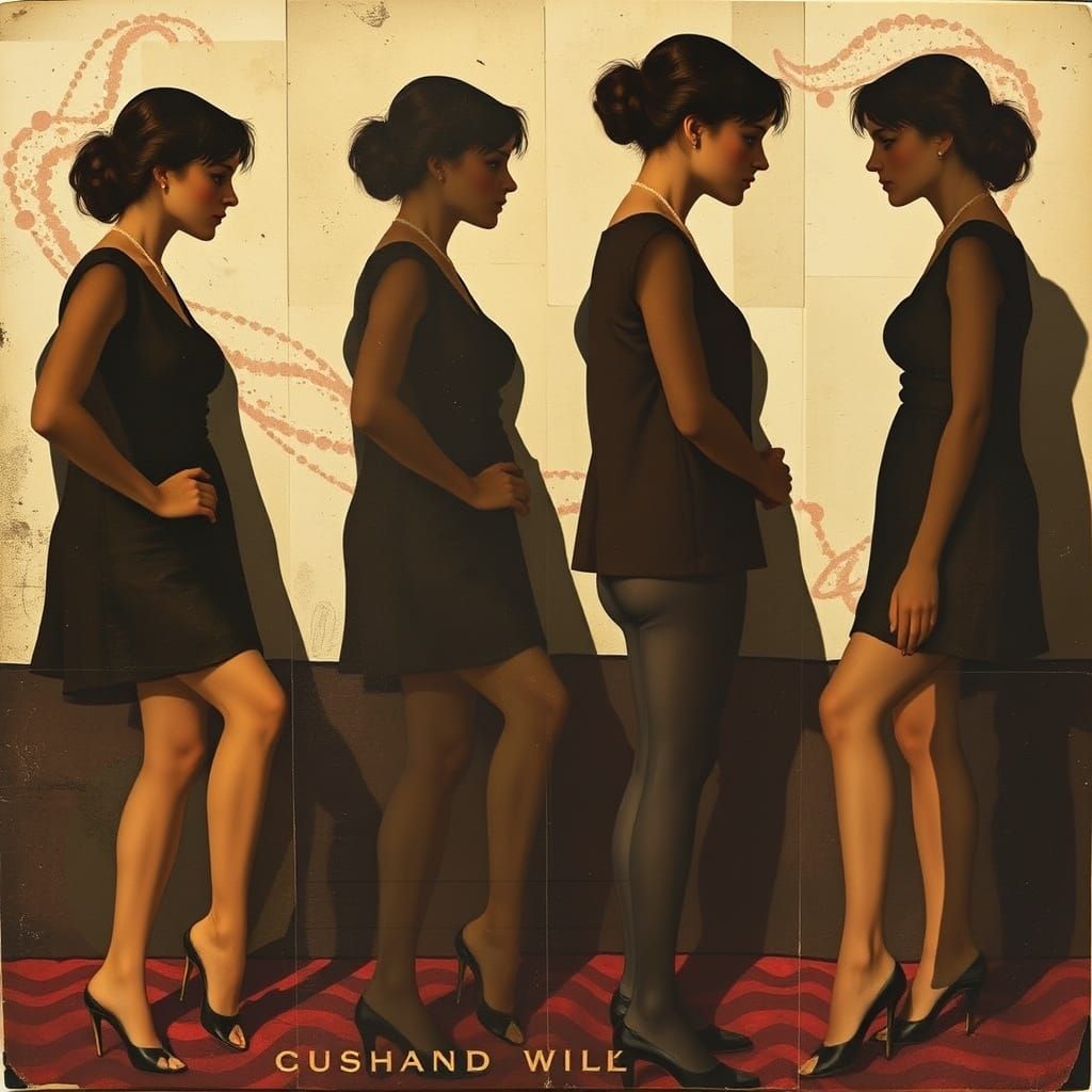This image is a mixed-media collage with textile patterns, body parts, and shadow play. It features color blocking and a 1920s vintage postcard aesthetic.