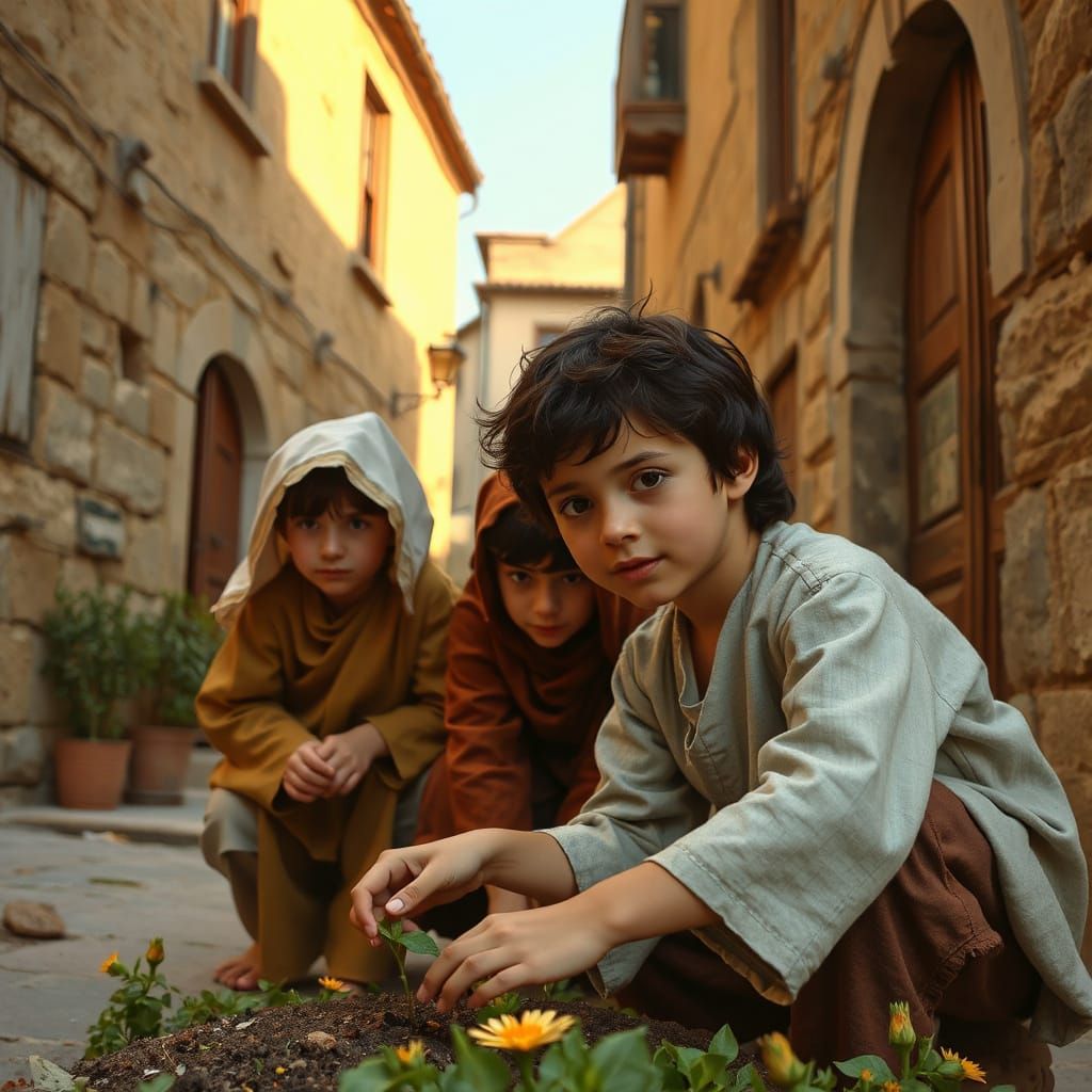This serene image captures a tender moment in ancient Nazareth as a young Jesus plants flowers with children amidst warm, golden light and timeless tranquility.