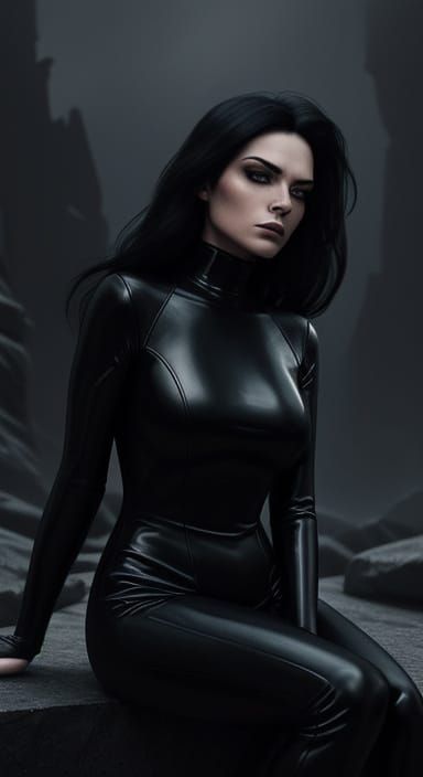 A woman sits in a dramatic, atmospheric scene, surrounded by dark, muted colors and deep crimson accents. Her sensual curves and mysterious gaze are illuminated by moody, low-key lighting, creating a sense of mystery and allure.