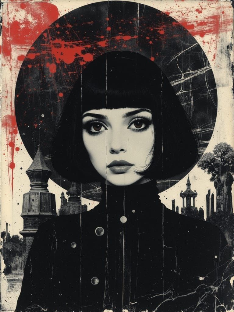 This image shows a beautiful gothic woman in a surreal, abstract style. The artwork evokes darkwave and postpunk aesthetics, with a colourful yet delicate goth-grunge feel.