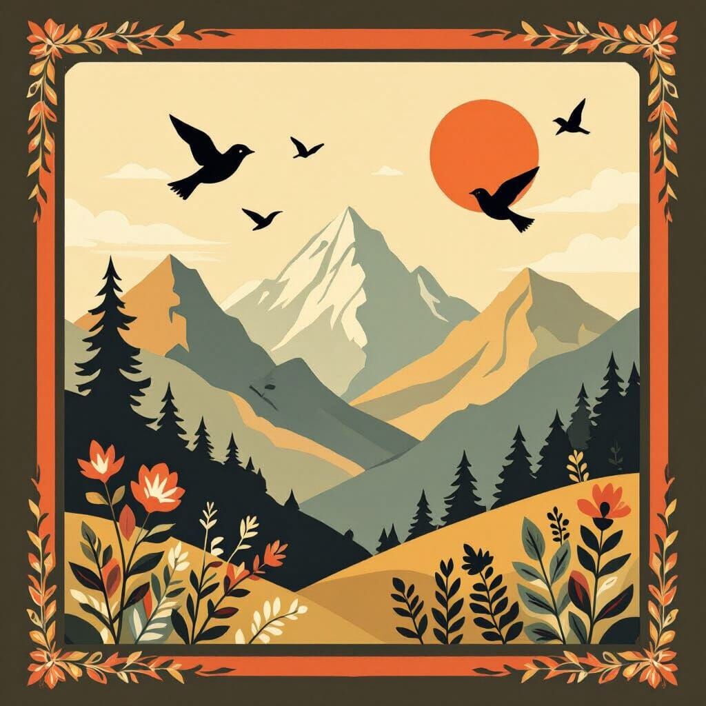 A vintage-style landscape featuring mountains and birds, perfect for a t-shirt design. The image showcases bold lines and earthy tones with stylized foliage, reminiscent of mid-century modern art.